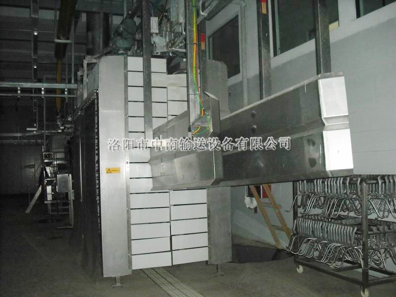 本機對懸掛輸送線上傳送運行中的毛豬,進行機械刷洗。該機采用對稱直立滾筒,,外接橡膠條,以及沖淋噴水管,對豬體進行洗刷。本機外型結(jié)構(gòu)簡潔,使用維護方便,是大中小型肉類加工廠選擇的設(shè)備。